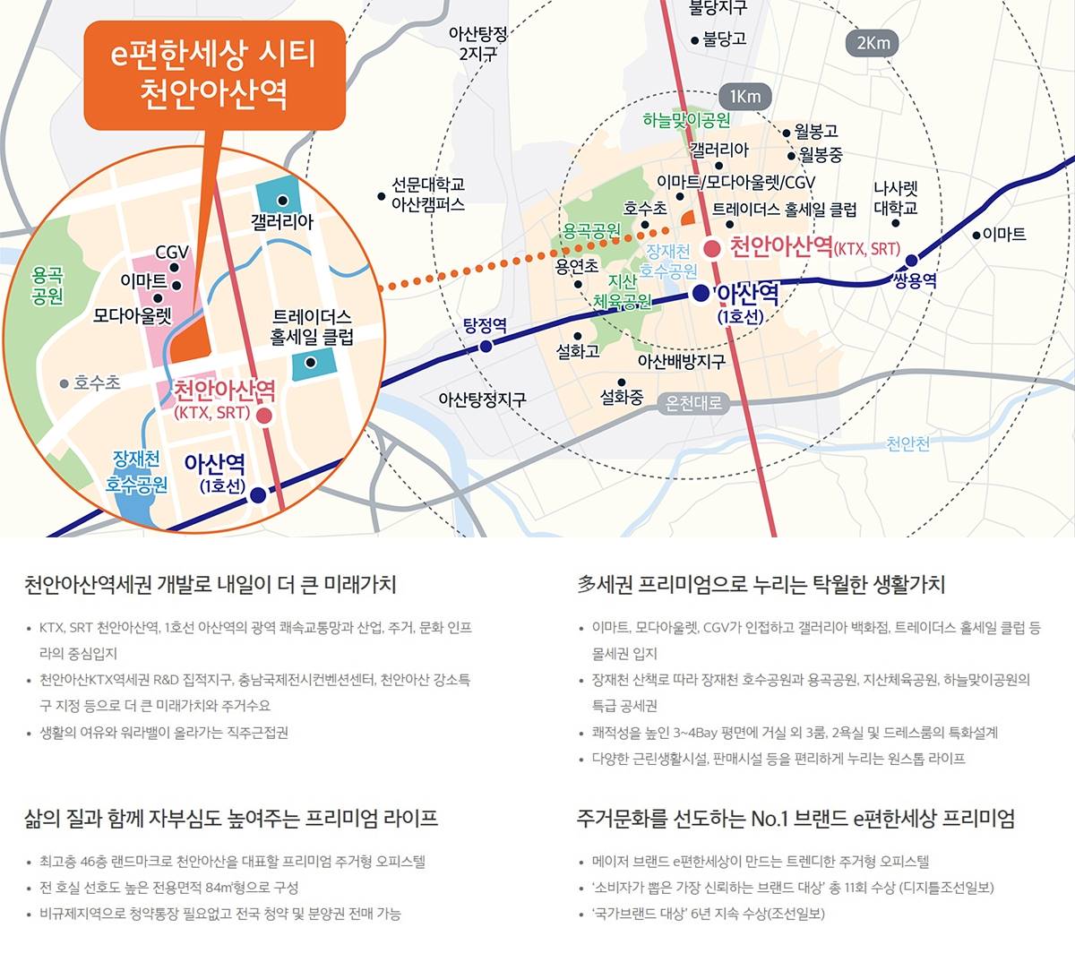 천안아산역 쿼드러플 역세권의 가치 KTX, SRT, 지하철 1호선, 장항선을 모두 누리는 중심 천안아산역과 아산역을 도보로 이용할 수 있어 서울까지 30분대 진입이 가능한 압도적인 광역 교통망을 자랑합니다. 최고 46층 높이의 랜드마크 스카이라인 아산의 하늘을 수놓는 총 396실 규모의 주거형 오피스텔 지상 최고 46층 높이의 웅장한 규모로 설계되어 지역을 상징하는 시그니처 단지이자 탁 트인 조망권을 제공합니다. 슬세권으로 누리는 완벽한 생활 인프라 갤러리아 백화점, 이마트 트레이더스, 모다아울렛 인접 단지 주변에 형성된 대형 쇼핑 시설과 문화 인프라를 통해 쇼핑부터 여가까지 원스톱으로 즐기는 편리한 도심 라이프가 가능합니다. 브랜드 파워 이편한세상의 특화 설계 공간 효율을 극대화한 84㎡ 단일 평면 구성 대한민국 주거 문화를 선도하는 이편한세상만의 기술력으로 아파트와 다름없는 넉넉한 공간과 혁신적인 수납 평면을 실현했습니다. 풍부한 배후 수요와 미래 비전 삼성디스플레이시티 및 대형 산업단지 인접 수혜 주변 대규모 산업단지의 직주근접 수요는 물론 천안아산역 복합환승센터 개발에 따른 지속적인 가치 상승을 기대할 수 있습니다. 입주민을 위한 고품격 커뮤니티 스크린골프실, 피트니스, 오피스 라운지 등 차별화 시설 단지 안에서 모든 것을 해결할 수 있도록 입주민 전용 고품격 시설들을 배치하여 삶의 질을 한 차원 더 높였습니다. 규제에서 자유로운 주거 대안 청약 통장 무관 및 거주지 제한 없는 신청 기회 아파트 대비 진입 장벽이 낮으면서도 핵심 입지를 선점할 수 있어 실수요자와 투자자 모두에게 매력적인 최적의 주거 상품입니다.